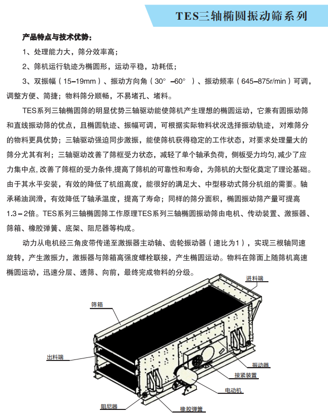 【产品简介】SPS型水平式三轴椭圆振动筛兼备了倾斜式圆振动筛和水平式直线振动筛的各自的优点,具有透筛性好、处理能力大、安装高度小的特点,是各种矿山,石矿场,移动式筛分站的理想设备。