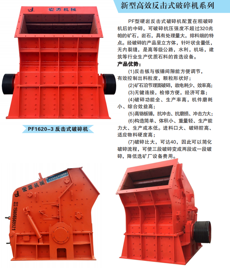 反击式破碎机价格合理,将配置在粗破碎机后的中碎,可破碎抗压强度不超过320兆帕的矿石、岩石,具有处理量大,排料量细的特点。经破碎的产品呈立方体,针叶状含量低无内裂缝,适用公路,水利,机场,建筑等行业。